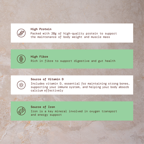 Pea Protein Isolate, Chocolate Flavoured Coating (Cocoa Butter, Soya Flour, Sweetener: Xylitol, Cocoa Mass, Emulsifier: Lecithin, Natural Flavouring), Soya Protein Nuggets (Soya Protein Isolate, Tapioca Starch, Salt), Sweetener: Maltitol, Beet Fibre, Date Syrup, Gluten-free Oats, Soya Protein Isolate, Chicory Root Fibre, Vitamins & Minerals (Calcium Phosphate, Potassium Chloride, Sodium Chloride, Choline Bitartrate, Magnesium Oxide, Ascorbic Acid, Ferrous Citrate, Zinc Citrate, Potassium Iodide, D-Alpha-Tocopheryl Acetate, Nicotinamide, Sodium Selenite, Manganese Citrate, Copper Gluconate, Vitamin A, Calcium Pantothenate, Vitamin D, Pyridoxine Hydrochloride, Riboflavin, Thiamine Hydrochloride, Vitamin K, Folic Acid, Cyanocobalamin, Sodium Molybdate, Biotin), Emulsifier: Lecithin, Peanut Paste, Humectant: Vegetable Glycerine, Natural Flavouring, Maltodextrin, Coconut Oil, Conjugated Linoleic Acid, Bulking Agent: Polydextrose, Water, Thickener: Gum Acacia, Vegetable Oil, Sweetener: Sucralose, Salt.