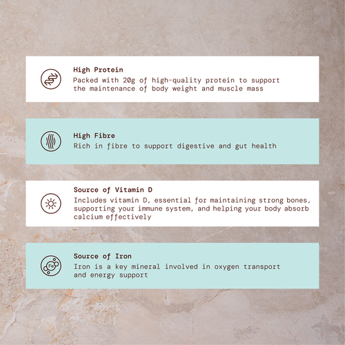 Pea Protein Isolate, Chocolate Flavoured Coating (Cocoa Butter, Soya Flour, Sweetener: Xylitol, Cocoa Mass, Emulsifier: Lecithin, Natural Flavouring), Soya Protein Nuggets (Soya Protein Isolate, Tapioca Starch, Salt), Sweetener: Maltitol, Beet Fibre, Date Syrup, Gluten-free Oats, Soya Protein Isolate, Chicory Root Fibre, Vitamins & Minerals (Calcium Phosphate, Potassium Chloride, Sodium Chloride, Choline Bitartrate, Magnesium Oxide, Ascorbic Acid, Ferrous Citrate, Zinc Citrate, Potassium Iodide, D-Alpha-Tocopheryl Acetate, Nicotinamide, Sodium Selenite, Manganese Citrate, Copper Gluconate, Vitamin A, Calcium Pantothenate, Vitamin D, Pyridoxine Hydrochloride, Riboflavin, Thiamine Hydrochloride, Vitamin K, Folic Acid, Cyanocobalamin, Sodium Molybdate, Biotin), Emulsifier: Lecithin, Peanut Paste, Humectant: Vegetable Glycerine, Natural Flavouring, Maltodextrin, Coconut Oil, Conjugated Linoleic Acid, Bulking Agent: Polydextrose, Water, Thickener: Gum Acacia, Vegetable Oil, Sweetener: Sucralose, Salt.