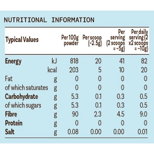 This neutral flavoured powder is an easy way to increase your daily soluble & insoluble dietary fibre intake - simply add to food or drinks to incorporate an additional 9g fibre. This vegan-friendly supplement contains a unique blend of two fibres, with no artificial colours or added sugar or sweeteners. Just 2 servings a day provides 30% of an adult's daily fibre needs (based on a daily fibre intake of 30g). It is suitable for children from 5 years too.