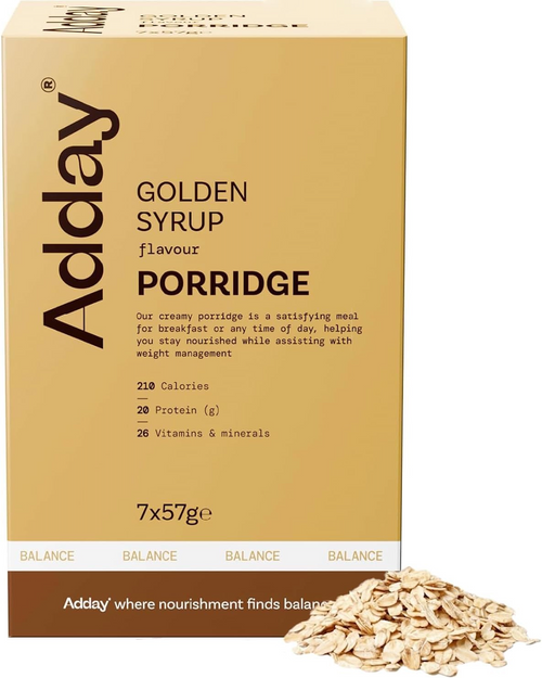 Adday Golden Syrup Flavour Porridge is suitable for vegetarian, Halal and Kosher diets. It is supplied in boxes of 7 handy sachets for convenient weight management support no matter where you are.